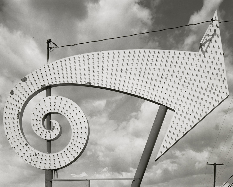 American photographer Jim Dow has long been fascinated by the ingenuity and creative spirit found in the built environment. Between 1967 and 1977, his first decade as a young photographer, he drove along old U.S. highways on numerous cross-country road trips, focusing his large format camera on time-worn signage extracted from billboards, diners, gas stations, drive-in theaters, ice cream stands, burger joints, and other small businesses. Indebted to Harry Callahan, with whom Dow studied at RISD, and the work of Walker Evans, another key mentor, Dow’s early photographs highlight the effects of time’s passage, as commercial tastes and styles shift from one era to the next. Though most of the subjects Dow photographed have long since disappeared, his images avoid nostalgic longing or ironic commentary. With reverence and humor, Dow conveys the importance making one’s mark on the land and celebrates the desire to express individual agency and creativity in the landscape we inhabit.