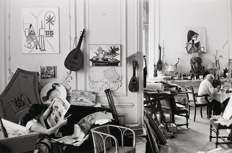 (Second page, upper image) David Douglas Duncan, American (born 1916). Picasso painting plates at the dining table, with Jacqueline reading, 1958, printed 2013. Inkjet print, 13 7/8 × 20 7/8 inches. The Nelson-Atkins Museum of Art, Kansas City, Missouri. Gift of David Douglas Duncan, 2014.11.81.