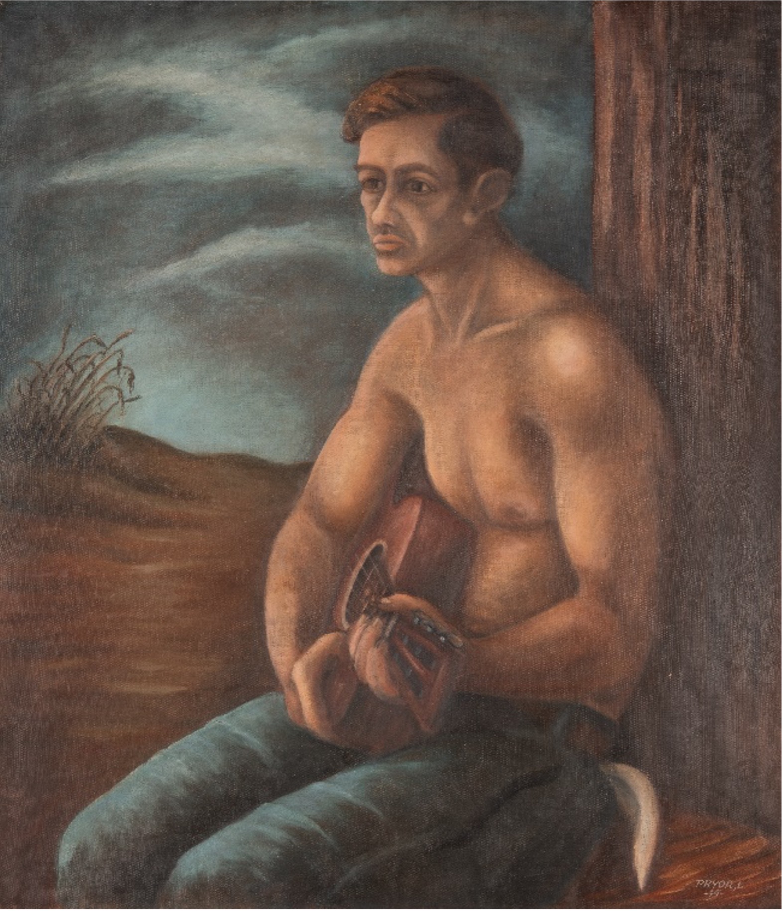Lonesome was painted when Pryor was a student at KCAI in 1950. This portrait of a solitary troubadour also reveals Benton’s influence in the undulating clouds, the treatment of musculature, and the rural subject matter. Until his death in 2015, Pryor readily credited Benton for his influence.