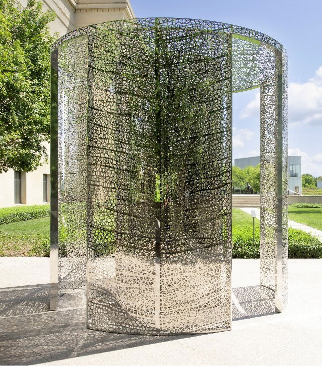 Kansas City, MO. Sept. 14, 2022–An arresting sculpture by Jan Hendrix, reminiscent of the pavilions found in 18th century gardens, will be unveiled in the Donald J. Hall Sculpture Park at The Nelson-Atkins Museum of Art in Kansas City on Sept. 14. The Dutch-born Hendrix, who lives in Mexico City, continued a two-decade long collaboration with Kansas City-based A. Zahner Company to fabricate Mirror Pavilion.